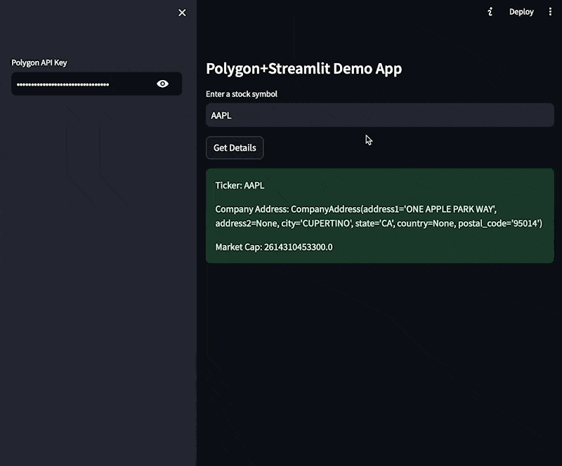 st.subheader("Polygon+Streamlit Demo App") symbol = st.text_input("Enter a stock symbol", "AAPL") with st.sidebar: #Get your Polygon API key from the dashboard. #In a real app you want to store this as a secret in your .env polygon_api_key = st.text_input("Polygon API Key", type="password") # Authenticate with the Polygon API client = RESTClient(polygon_api_key) col1, col2, col3 = st.columns(3)