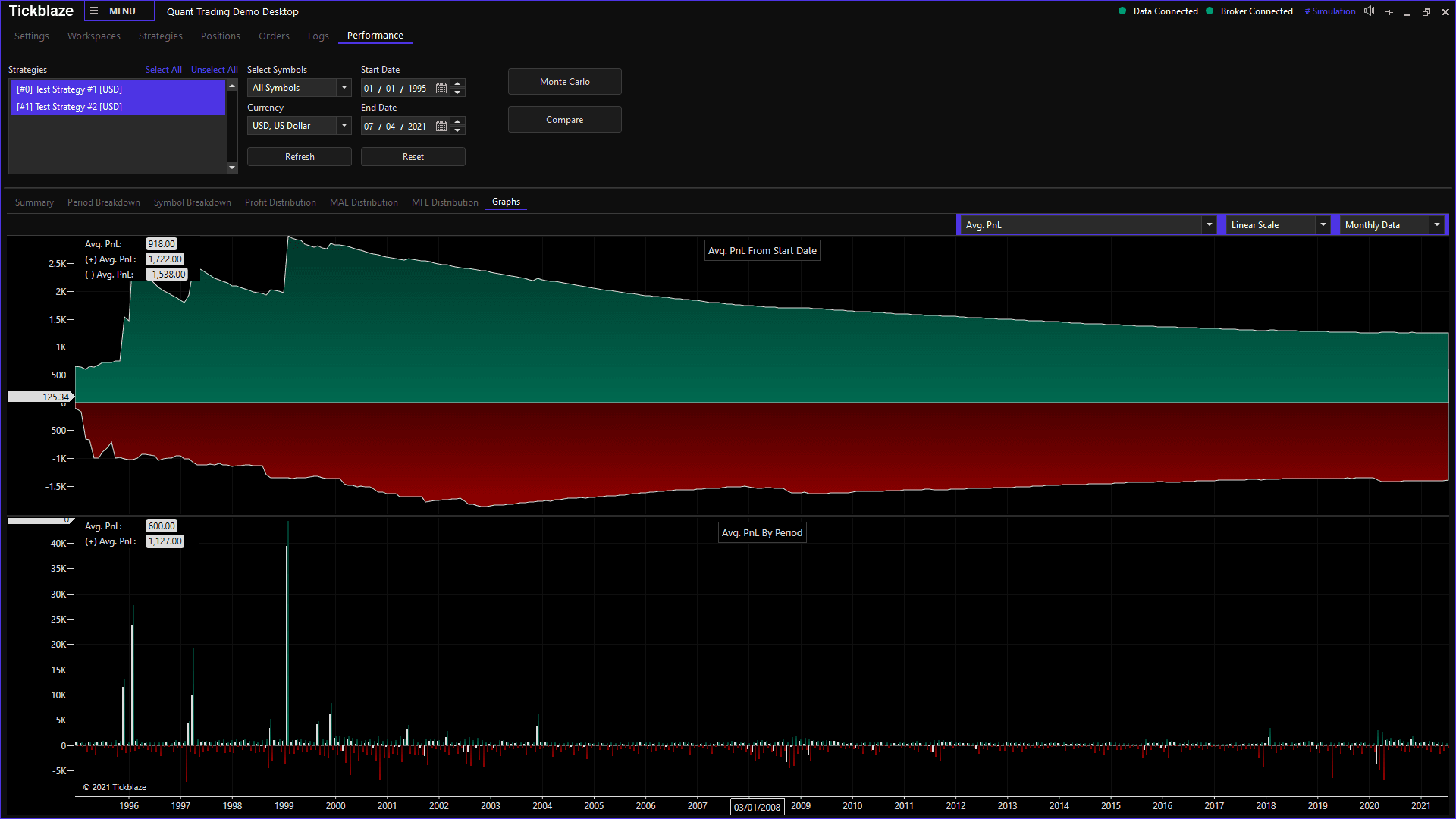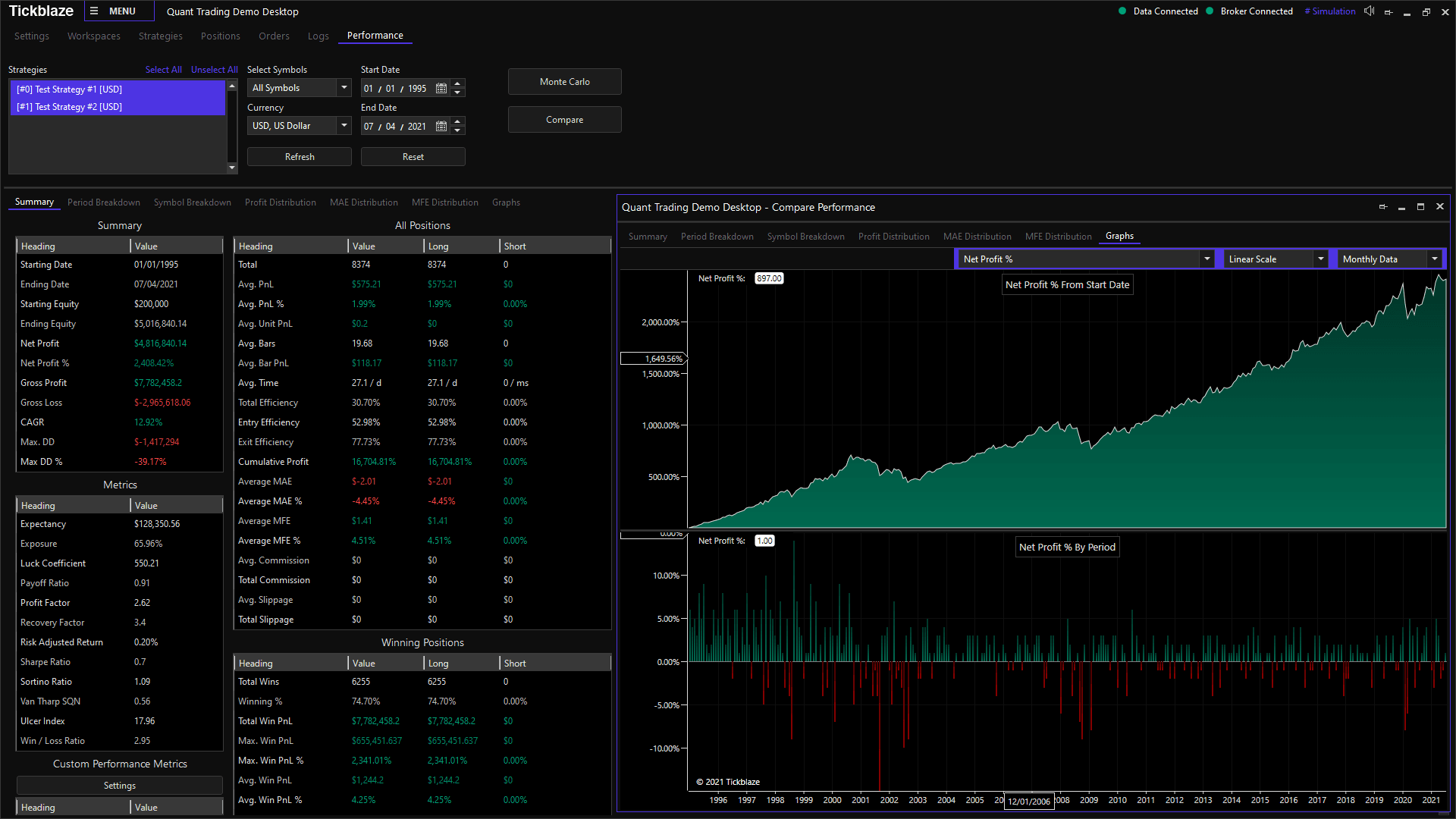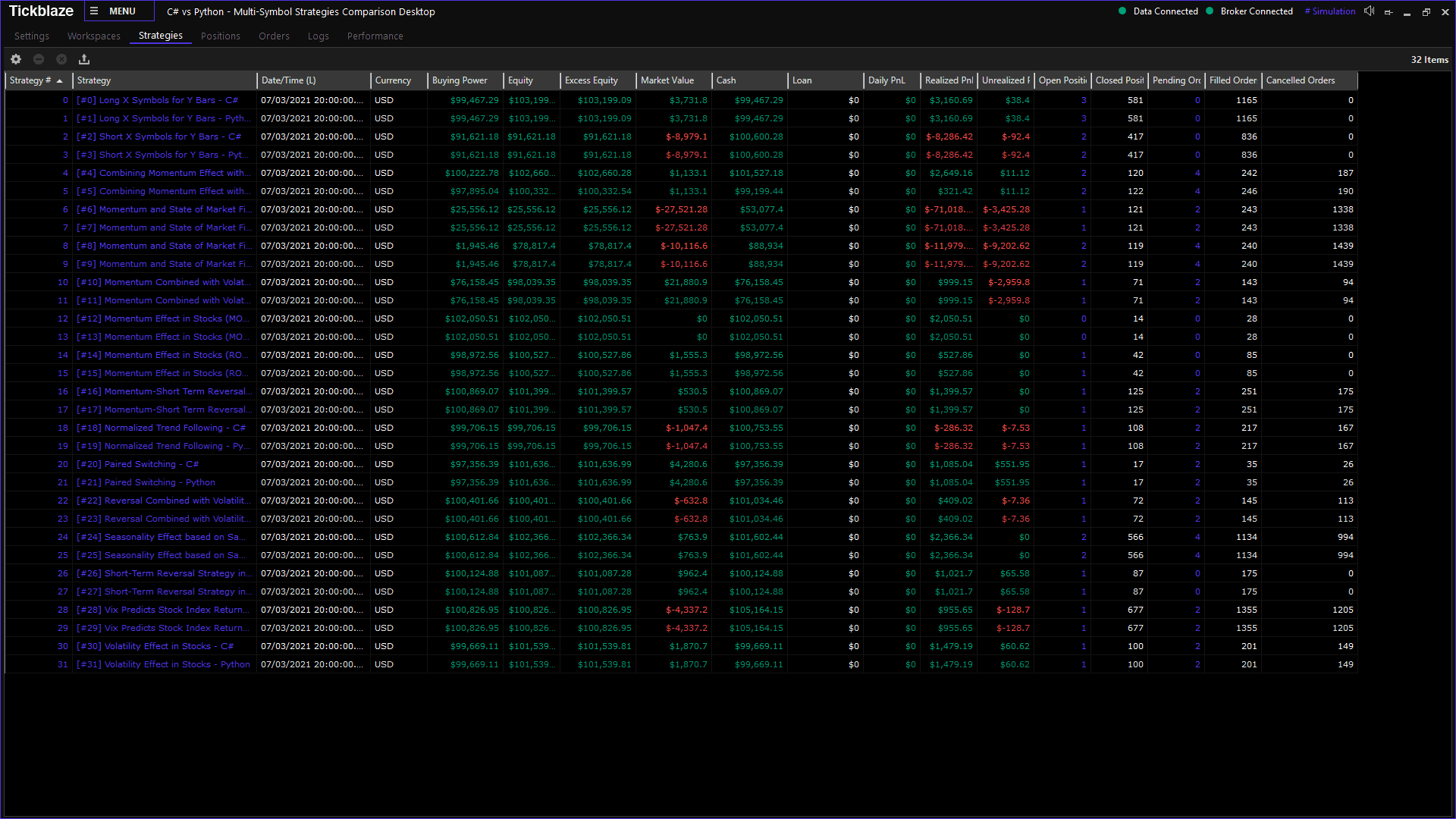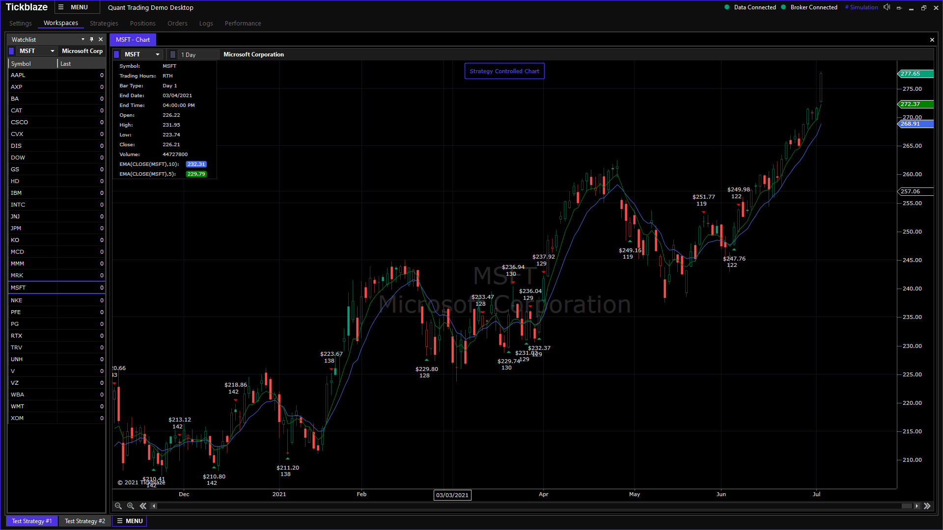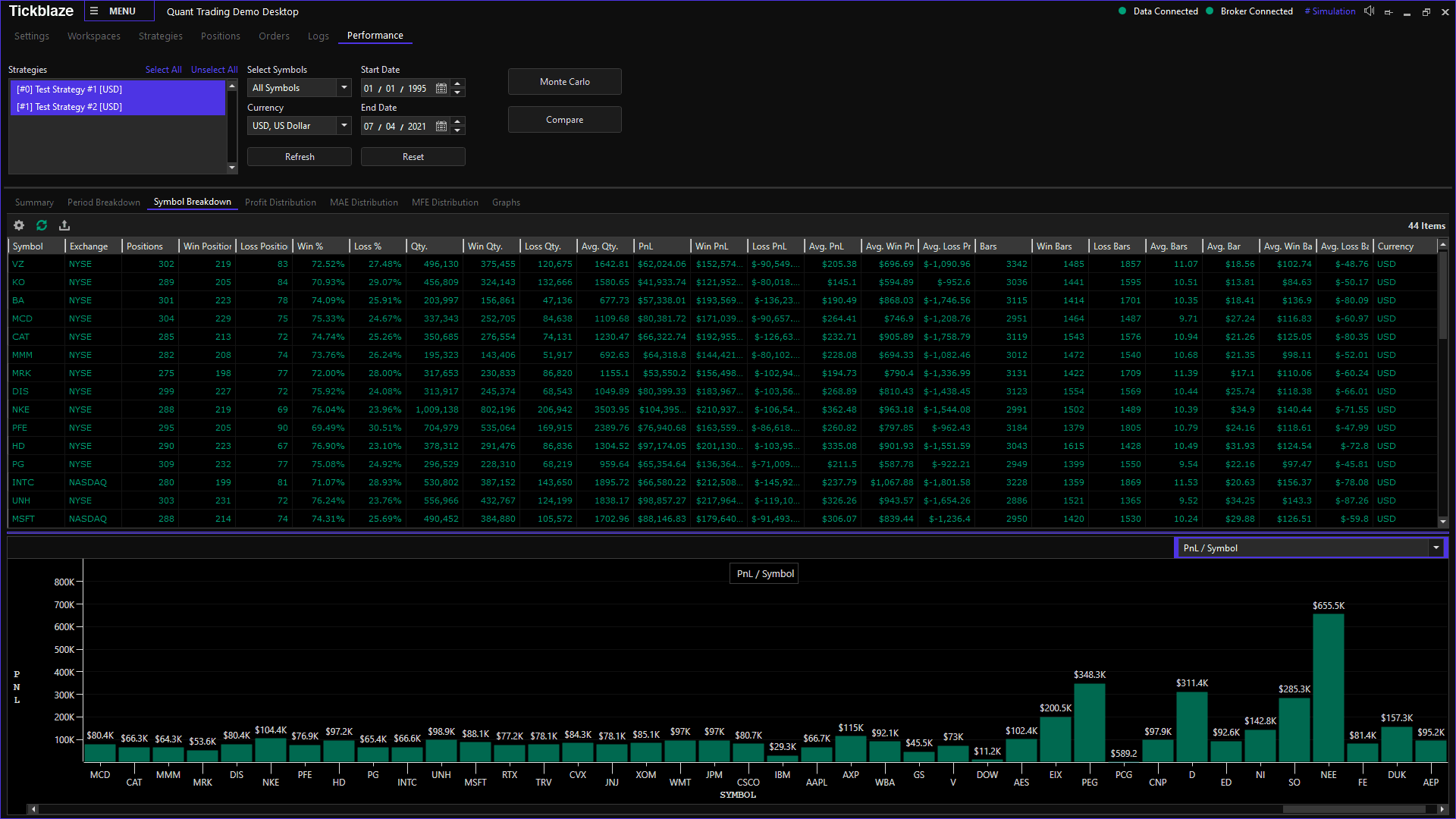 Quants can use Tickblaze and polygon.io to design, backtest and execute a portfolio of trading strategies, either on their own local workstation or on the cloud. Each strategy in the portfolio is assigned a trading strategy script, an underlying bar interval, and one or more symbols. Tickblaze can backtest and trade both standard and exotic bar intervals, including ticks, minutes days, renko, range, and many others.