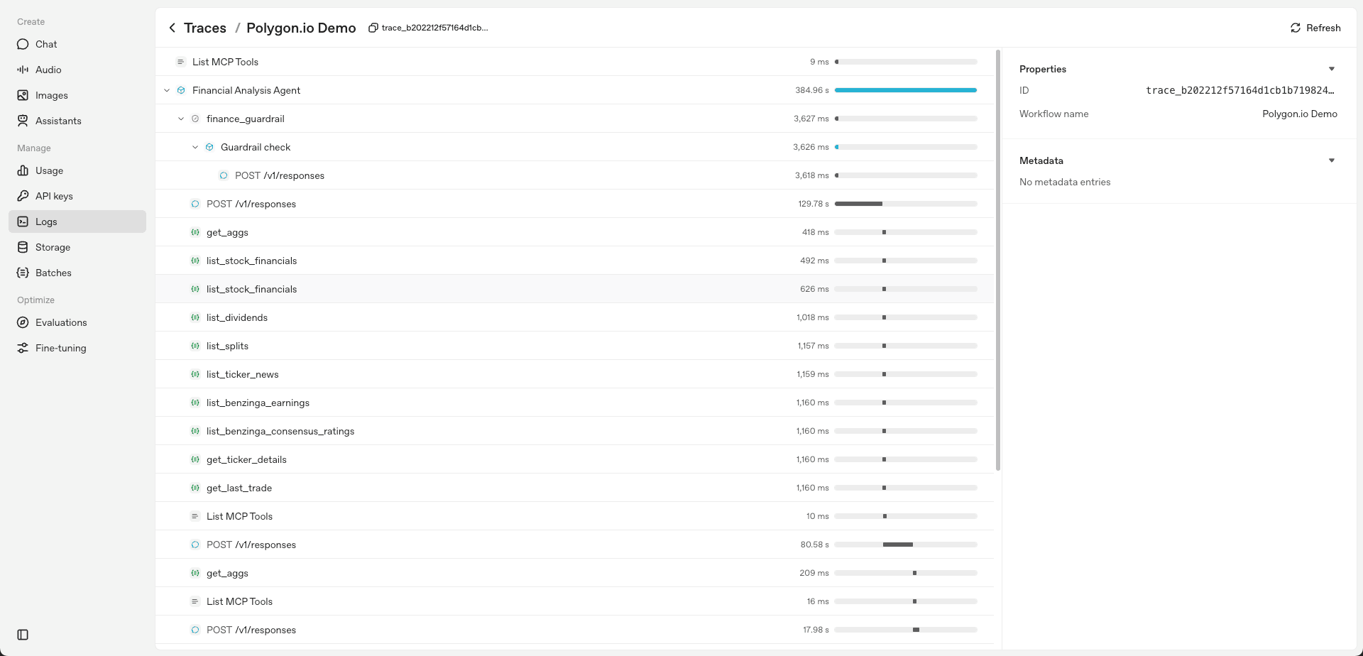 OpenAI also has an awesome debugging tool called the Traces dashboard. It will automatically pick up all of the steps that the demo makes. You can then click into each step, and see what/if any errors appear.