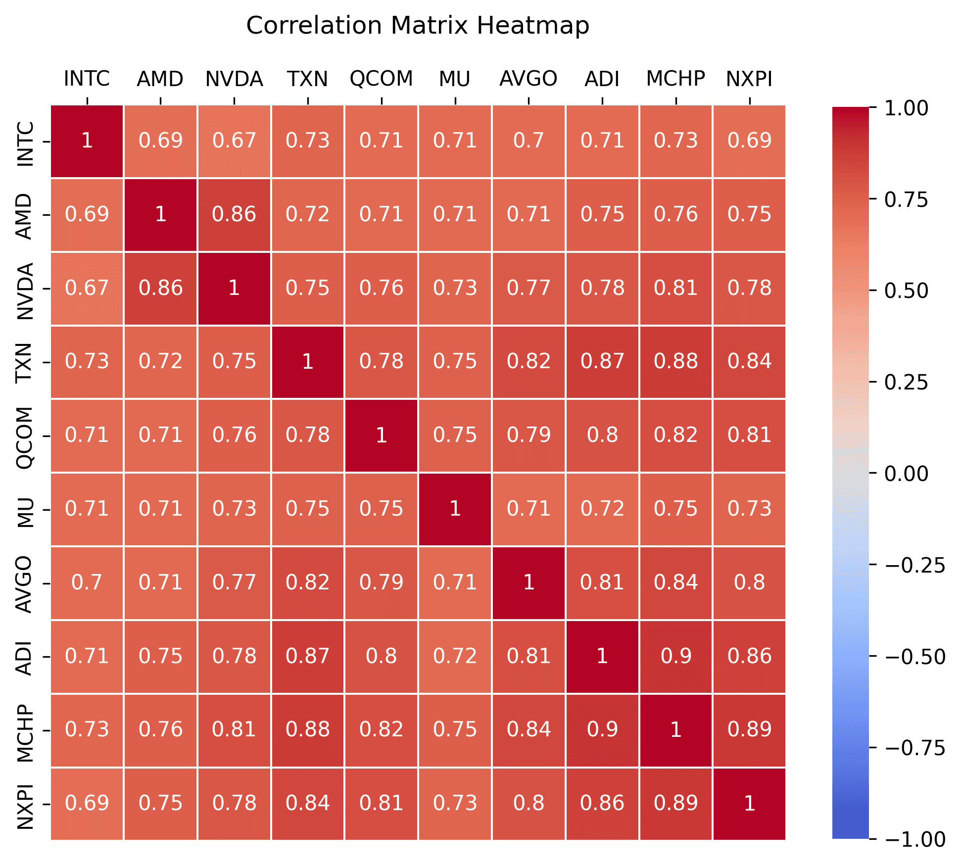 INTC AMD NVDA TXN QCOM MU AVGO ADI MCHP NXPI INTC 1.000000 0.688225 0.668148 0.728849 0.705444 0.705384 0.704072 0.707094 0.725683 0.693339 AMD 0.688225 1.000000 0.863082 0.723755 0.714276 0.712958 0.712381 0.751192 0.763786 0.752658 NVDA 0.668148 0.863082 1.000000 0.751007 0.761949 0.729233 0.767373 0.780262 0.812928 0.783573 TXN 0.728849 0.723755 0.751007 1.000000 0.778992 0.747224 0.823659 0.871440 0.877141 0.842469 QCOM 0.705444 0.714276 0.761949 0.778992 1.000000 0.748538 0.787640 0.798045 0.819367 0.812557 MU 0.705384 0.712958 0.729233 0.747224 0.748538 1.000000 0.705517 0.716119 0.753912 0.730331 AVGO 0.704072 0.712381 0.767373 0.823659 0.787640 0.705517 1.000000 0.808928 0.839874 0.801082 ADI 0.707094 0.751192 0.780262 0.871440 0.798045 0.716119 0.808928 1.000000 0.901758 0.857143 MCHP 0.725683 0.763786 0.812928 0.877141 0.819367 0.753912 0.839874 0.901758 1.000000 0.889236 NXPI 0.693339 0.752658 0.783573 0.842469 0.812557 0.730331 0.801082 0.857143 0.889236 1.000000