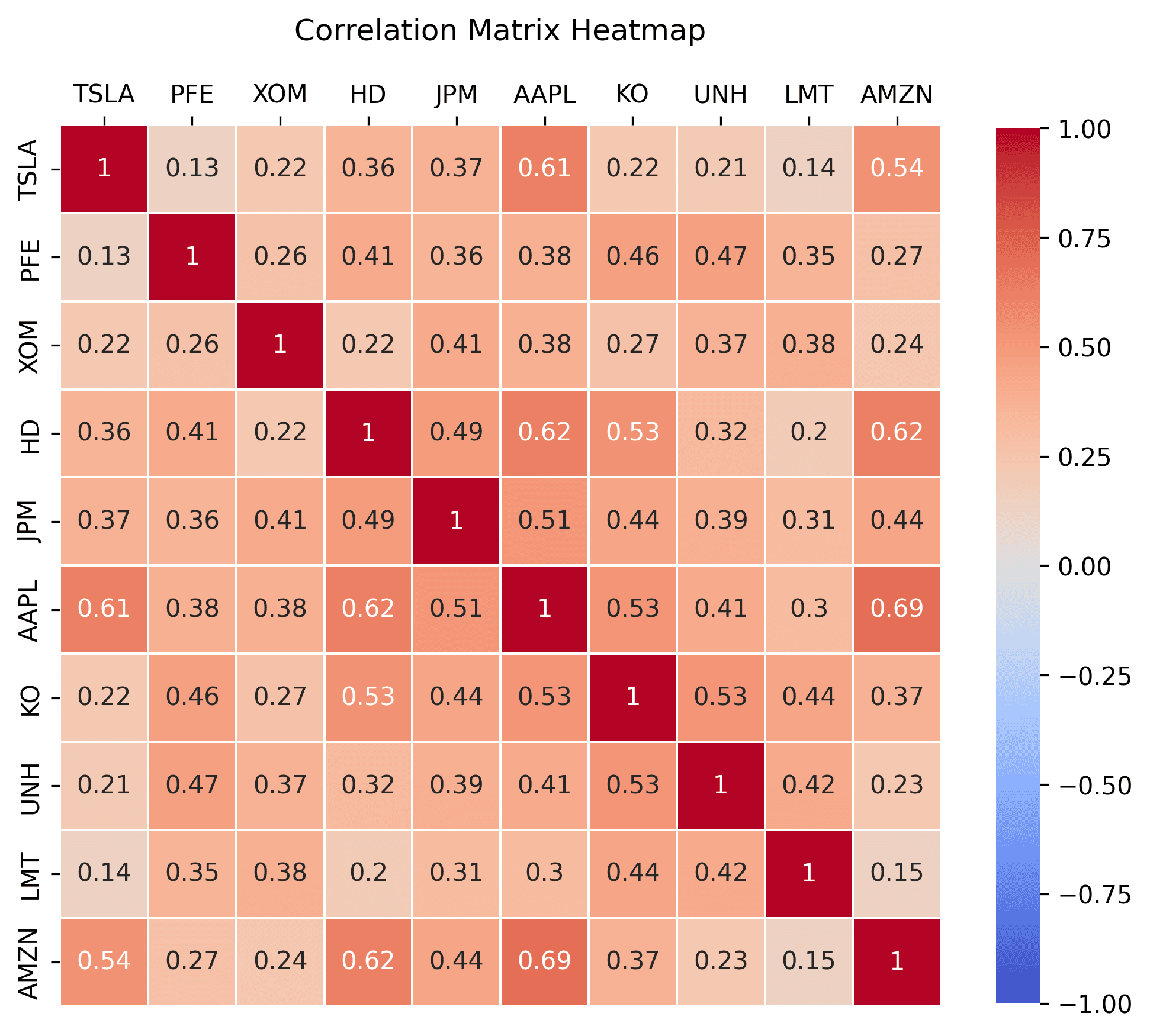 The resulting image, provides a visually intuitive representation of the correlation matrix, so that you can quickly identify both highly correlated and uncorrelated stocks. The heatmap's color scale ranges from -1 (indicating a perfect negative correlation) to 1 (indicating a perfect positive correlation), with the varying shades of color in between representing the degree of correlation.