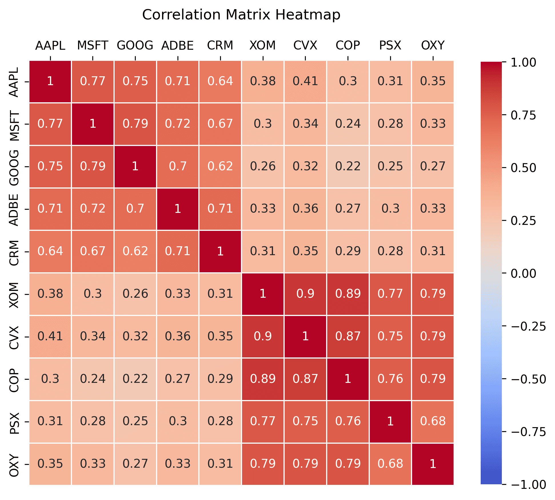Here is another example, of stocks that are divided into two distinct groups: technology and oil. The technology group are likely to be highly correlated due to their shared sector influences. Conversely, the oil group, are also likely to move in tandem due to shared influences like global oil prices, energy demand, and environmental regulations. However, given the distinct market forces and sector-specific risks affecting technology and oil stocks, these two groups are expected to be less correlated with each other.