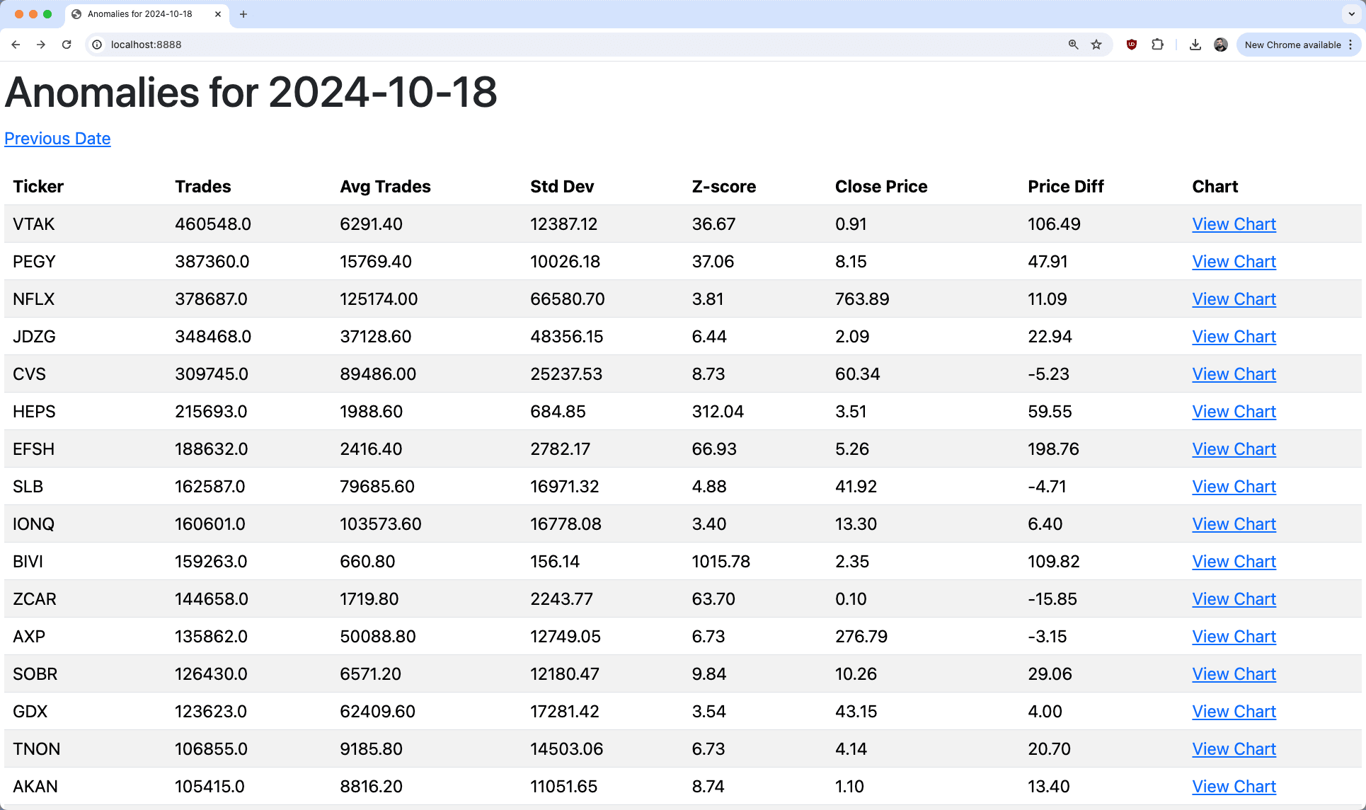 The browser-based interface provides a hands-on way to visually compare and analyze the anomalies. By clicking through different dates and tickers, you can view detailed trading data including volume, price movements, and more. This visual representation aids in understanding the scale and impact of each anomaly, offering insights that are not easily discernible from raw data alone.
