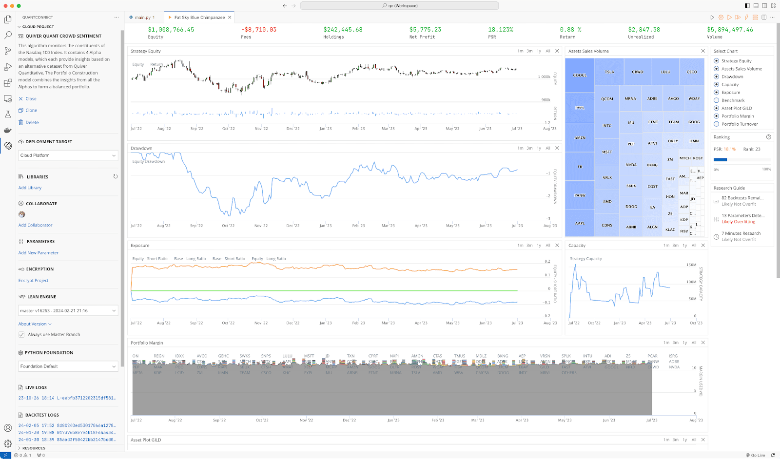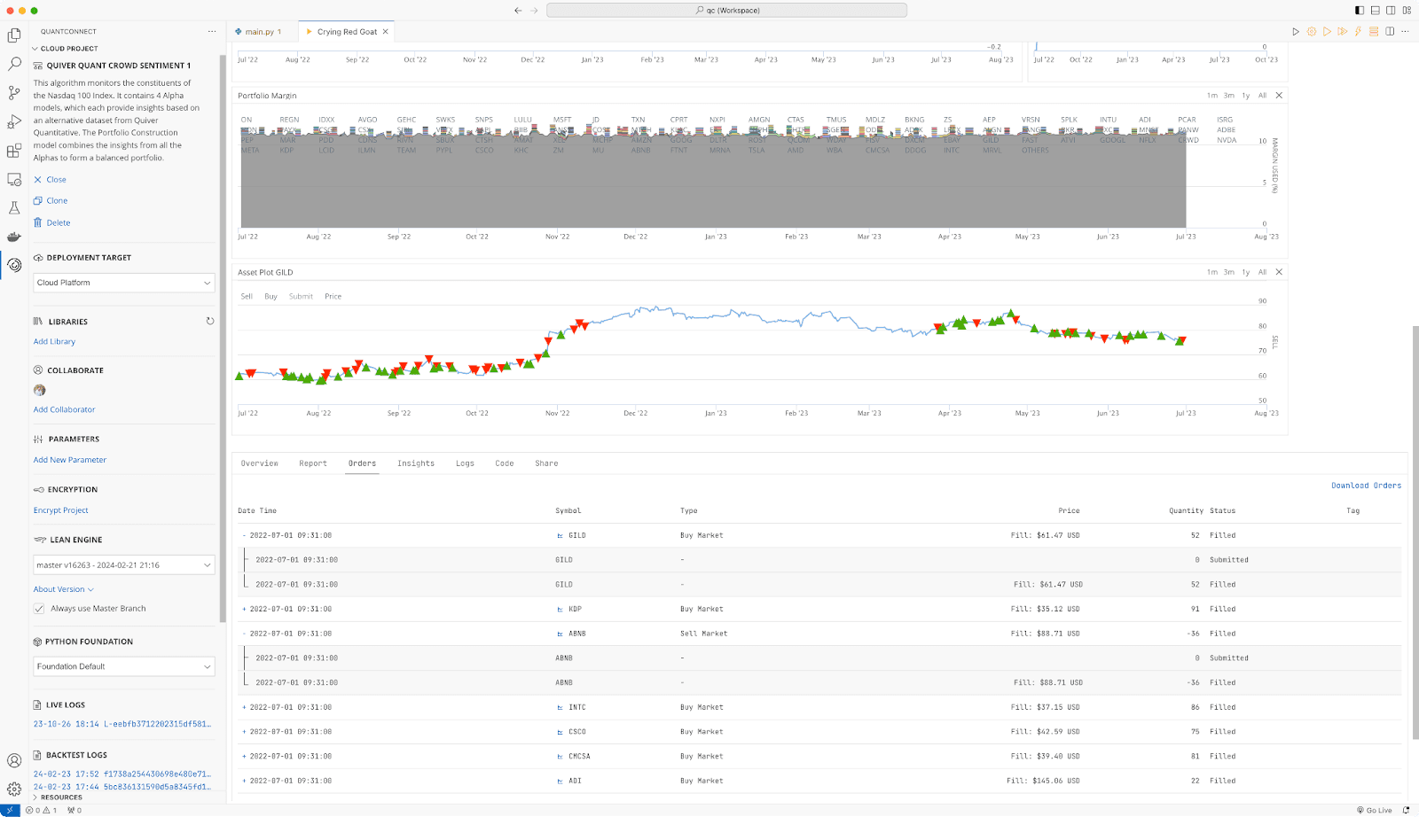 Backtesting: Quickly backtest multiple asset classes, time-horizons, with full portfolio management and margin modeling. Detailed spread, fee, and slippage models are baked in, letting you focus on your quantitative research.