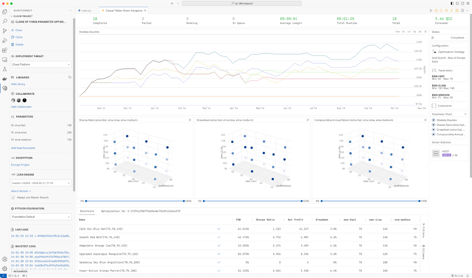 Parameter Optimization: Perform grid-search parameter sensitivity analysis to optimize ideal parameter sets for your strategy.
