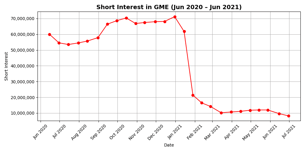 def plot_short_interest(data): plt.figure(figsize=(10, 5)) plt.plot(data['date'], data['short_interest'], marker='o', linestyle='-', color='red') plt.title('Short Interest in GME (Jun 2020 – Jun 2021)', fontsize=14, fontweight='bold') plt.xlabel('Date') plt.ylabel('Short Interest') plt.grid(True) plt.gca().xaxis.set_major_locator(mdates.MonthLocator()) plt.gca().xaxis.set_major_formatter(mdates.DateFormatter('%b %Y')) plt.xticks(rotation=45) plt.gca().yaxis.set_major_formatter(ticker.StrMethodFormatter('{x:,.0f}')) plt.tight_layout() plt.show() plot_short_interest(gme_short_interest)