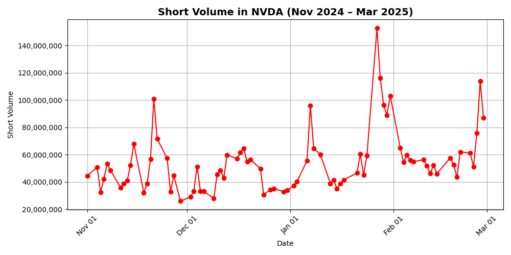 def plot_short_volume(data): plt.figure(figsize=(10, 5)) plt.plot(data['date'], data['short_volume'], marker='o', linestyle='-', color='red') plt.title('Short Volume in NVDA (Nov 2024 – Mar 2025)', fontsize=14, fontweight='bold') plt.xlabel('Date') plt.ylabel('Short Volume') plt.grid(True) plt.gca().xaxis.set_major_locator(mdates.MonthLocator()) plt.gca().xaxis.set_major_formatter(mdates.DateFormatter('%b %d')) plt.xticks(rotation=45) plt.gca().yaxis.set_major_formatter(ticker.StrMethodFormatter('{x:,.0f}')) plt.tight_layout() plt.show() plot_short_volume(nvda_short_volume)