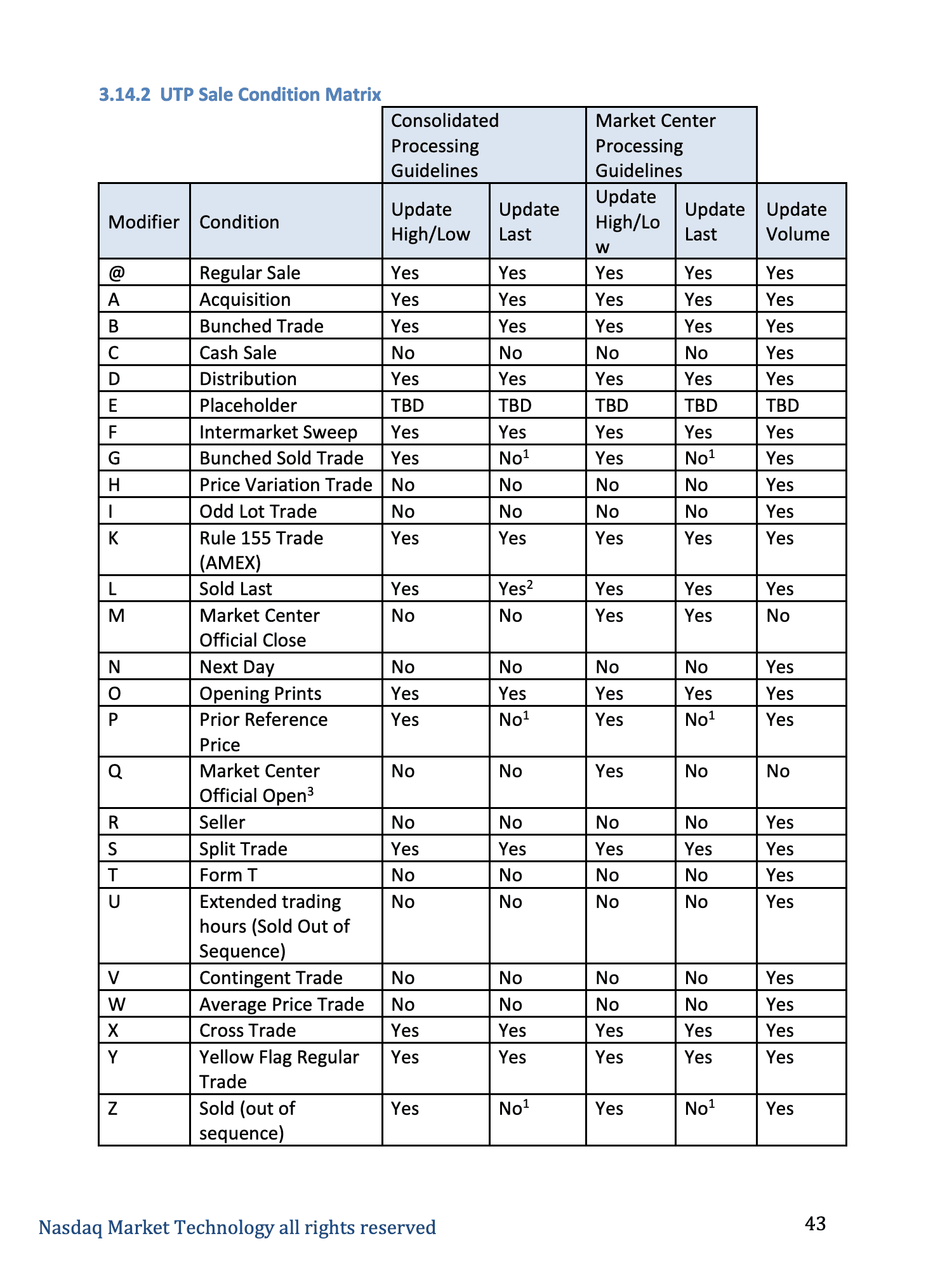 Like the CTA specification, the UTP plan has its own rules and regulations regarding the eligibility of trades to update aggregates. While the CTA Plan specification pertains to updating the OHLC values, the UTP plan uses these conditions to determine when to update the HLCV or High, Low, Close, and Volume values.