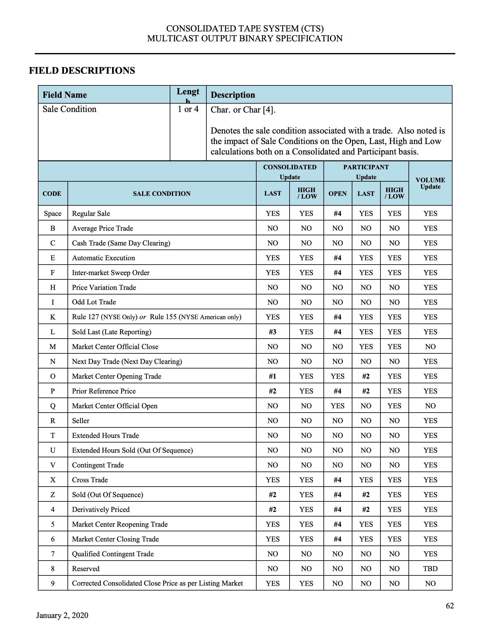 That is the TLDR for the CTA’s specification regarding Sale Conditions and their eligibility to be included into the OHLC aggregates. If you still yearn for more information, check out pages 62-64 of the following document: https://www.ctaplan.com/publicdocs/ctaplan/notifications/trader-update/CTS_BINARY_OUTPUT_SPECIFICATION.pdf