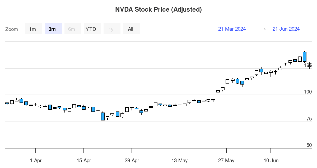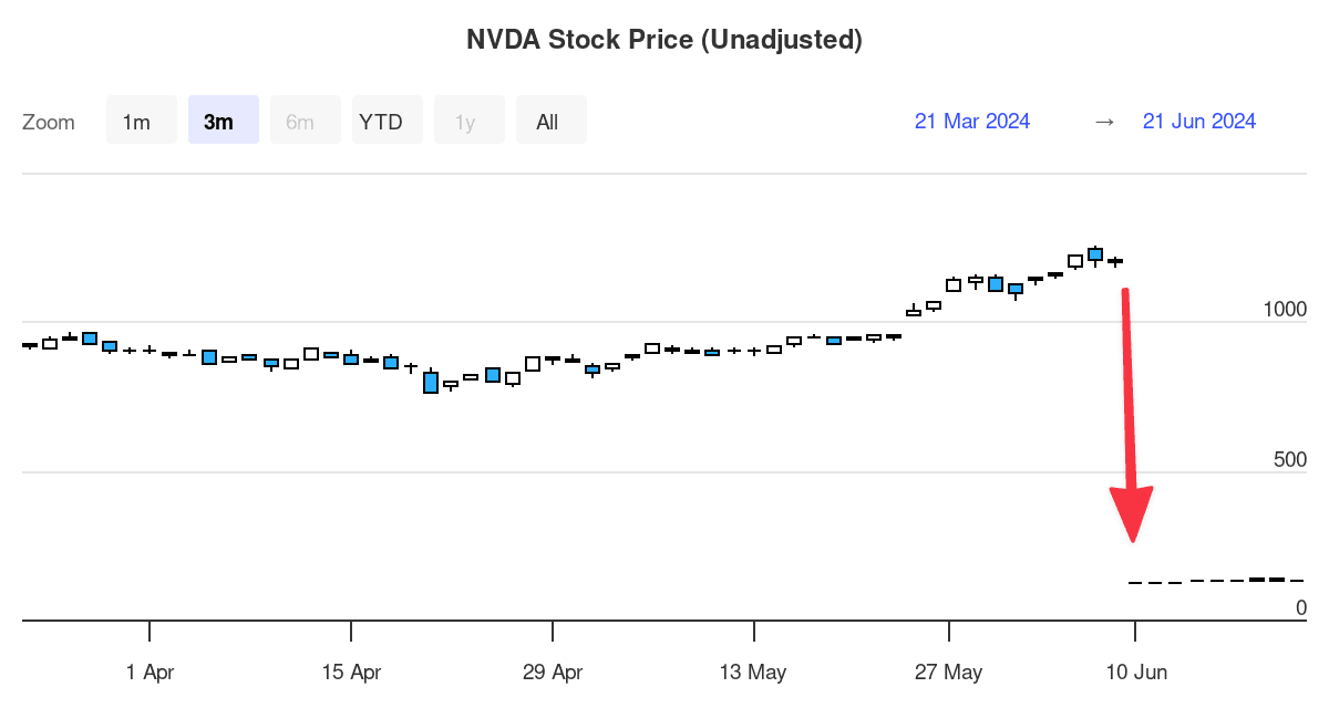 This results in significant price changes on the dates when stock splits occurred. For instance, on June 10, 2024, there was a 10-for-1 stock split for Nvidia. In the unadjusted data, you can observe the price appearing to drop dramatically from around $1,200 to $120, which could be misleading without knowledge of the split:
